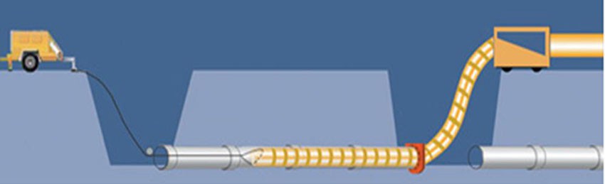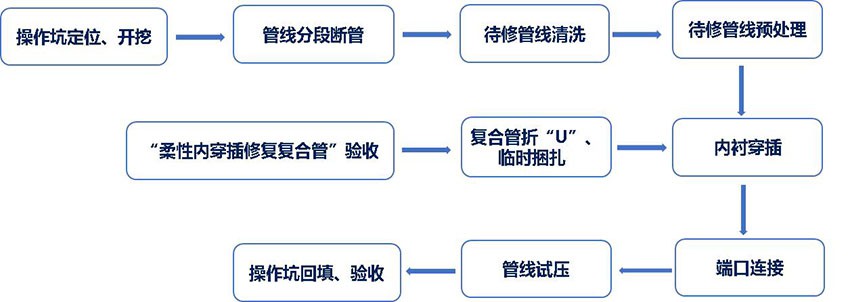 內(nèi)襯復(fù)合軟管的修復(fù)工藝是將外徑等于或略小于舊管道內(nèi)徑的復(fù)合管,通過(guò)變形設(shè)備將柔性復(fù)合管軋成“U”型并暫時(shí)捆綁使其直徑減小,通過(guò)牽引機(jī)將柔性復(fù)合管穿入舊管道,然后用水或壓縮空氣將其漲開恢復(fù)到原來(lái)的直徑,使內(nèi)襯管貼到舊管道的內(nèi)壁上,形成合二為一的“管中管”復(fù)合結(jié)構(gòu)。